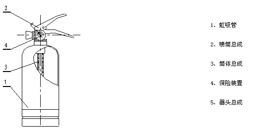 該滅火器主要由筒體總成、器頭總成、噴管總成等組成,滅火劑為磷酸銨鹽干粉滅火劑(又稱ABC干粉),驅動氣體為氮氣,常溫下其工作壓力為1.5MPa。
