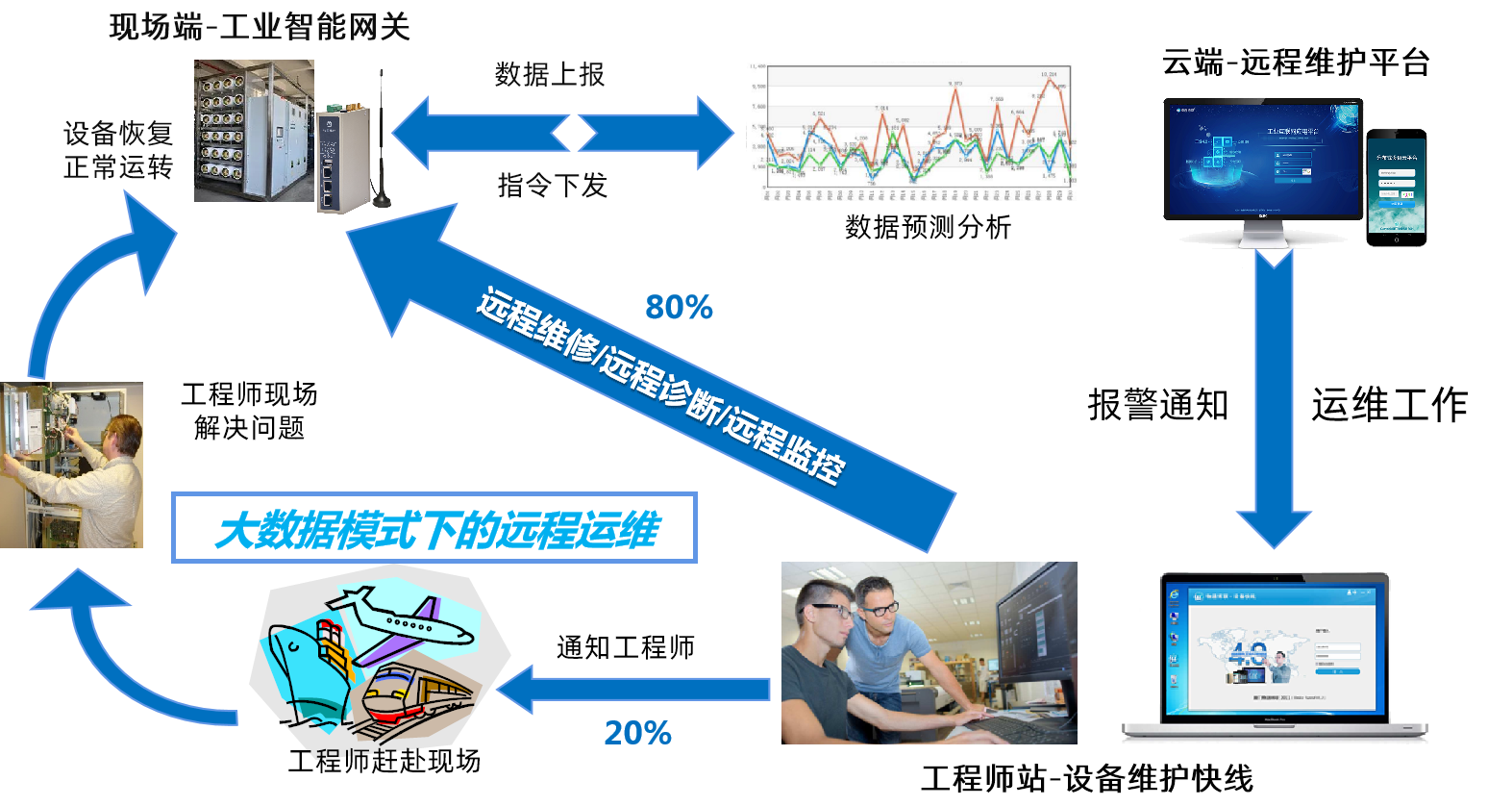 物通博聯(lián)設(shè)備遠(yuǎn)程維護(hù)系統(tǒng)由現(xiàn)場端的工業(yè)智能網(wǎng)關(guān)、工程師站的設(shè)備維護(hù)快線、云端的設(shè)備遠(yuǎn)程運營管理平臺三部分組成,構(gòu)建了一條通往遠(yuǎn)端工業(yè)現(xiàn)場的遠(yuǎn)程維護(hù)的安全數(shù)據(jù)通道,實現(xiàn)工程師對設(shè)備遠(yuǎn)程維護(hù)、診斷、調(diào)試和遠(yuǎn)程上下載程序,極大降低工程師出差成本,提高工程師的工作效率,實現(xiàn)了預(yù)防式遠(yuǎn)程維護(hù)及管理。