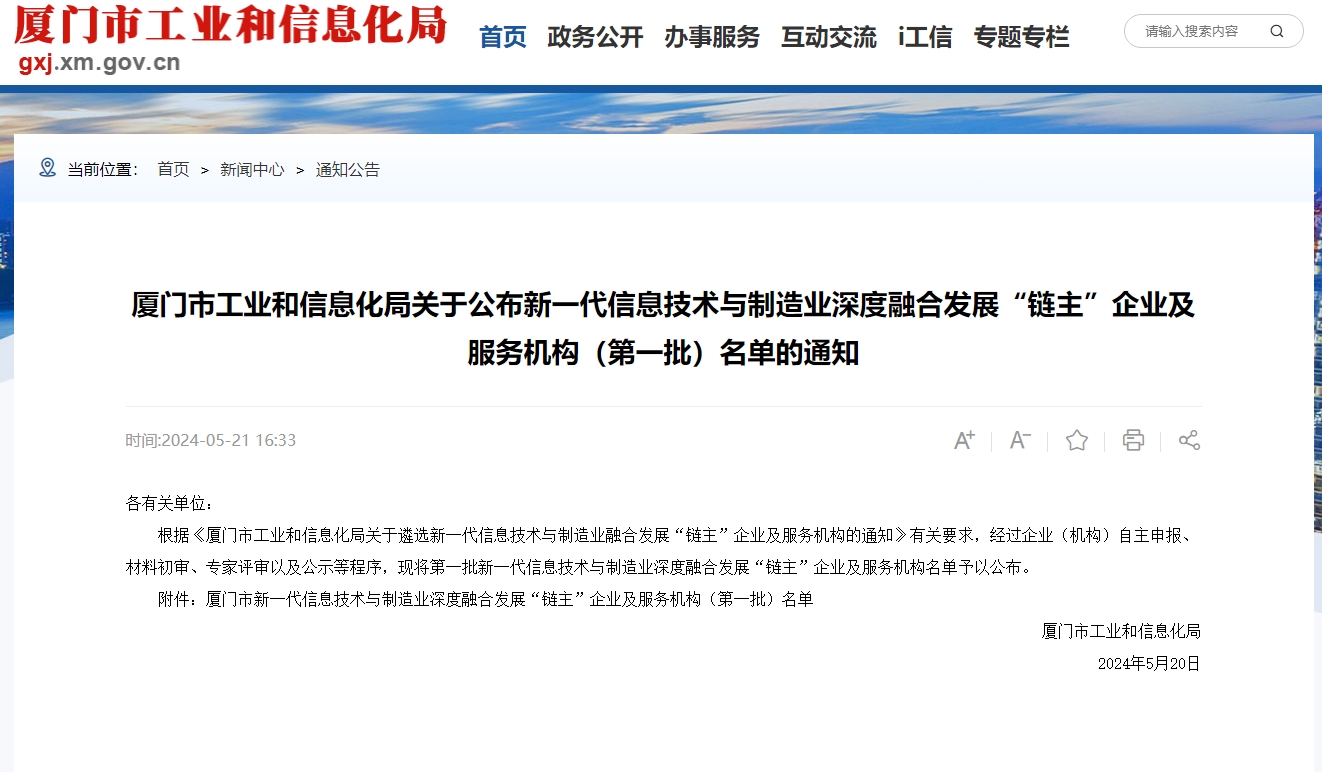 近日,廈門市工業(yè)和信息化局公示了【廈門市新一代信息技術(shù)與制造業(yè)融合發(fā)展“鏈主”企業(yè)及服務(wù)機構(gòu)(第一批)名單】的遴選結(jié)果,物通博聯(lián)憑借專業(yè)的數(shù)字化轉(zhuǎn)型服務(wù)能力和高質(zhì)量的落地服務(wù)經(jīng)驗,入選廈門市首批“新一代信息技術(shù)與制造業(yè)深度融合發(fā)展云服務(wù)商(平臺)”。