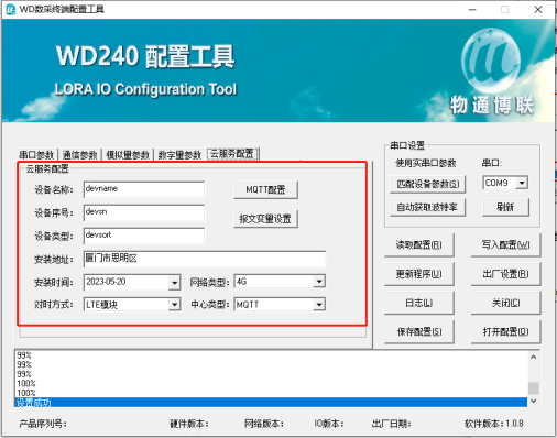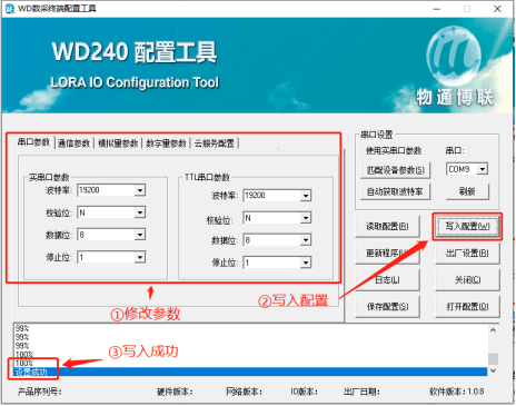 可以通過配置工具修改WD140設備的串口參數以及通訊參數(相關配置的說明請繼續閱讀此文檔),修改完成后點擊“寫入配置”,等待下方提示寫入成功后即可。