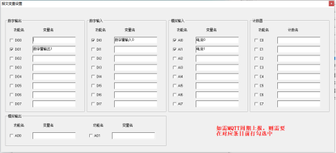 注:如果需要配置串口數據透傳到MQTT服務器,只需要在上下行主題加入“trans”字樣即可,主題中含有“trans”即代表網關為透傳模式。配置好MQTT參數后,關閉子窗口,點擊“報文變量設置”,可自定義變量名稱,可按需設置需要上報的點位,在需要上報的點位名稱前面打鉤即可,如下圖: