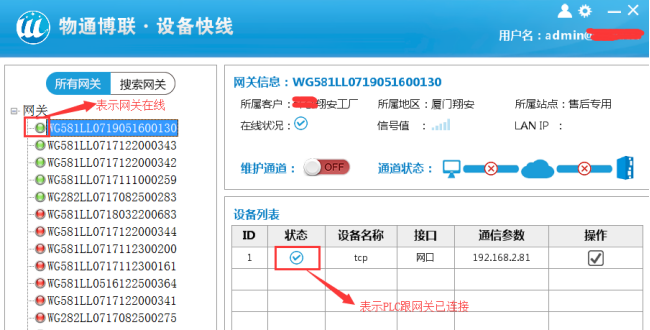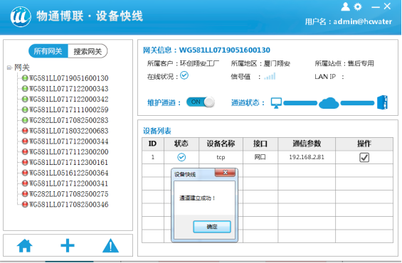 (2)選擇需要維護的網關,建立維護通道