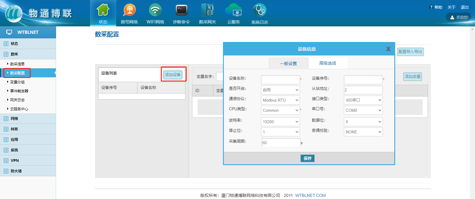添加設(shè)備:設(shè)備名稱和設(shè)備序號可以自定義,從站地址、通訊協(xié)議和通訊參數(shù)根據(jù)設(shè)備實(shí)際參數(shù)進(jìn)行配置,最后保存。