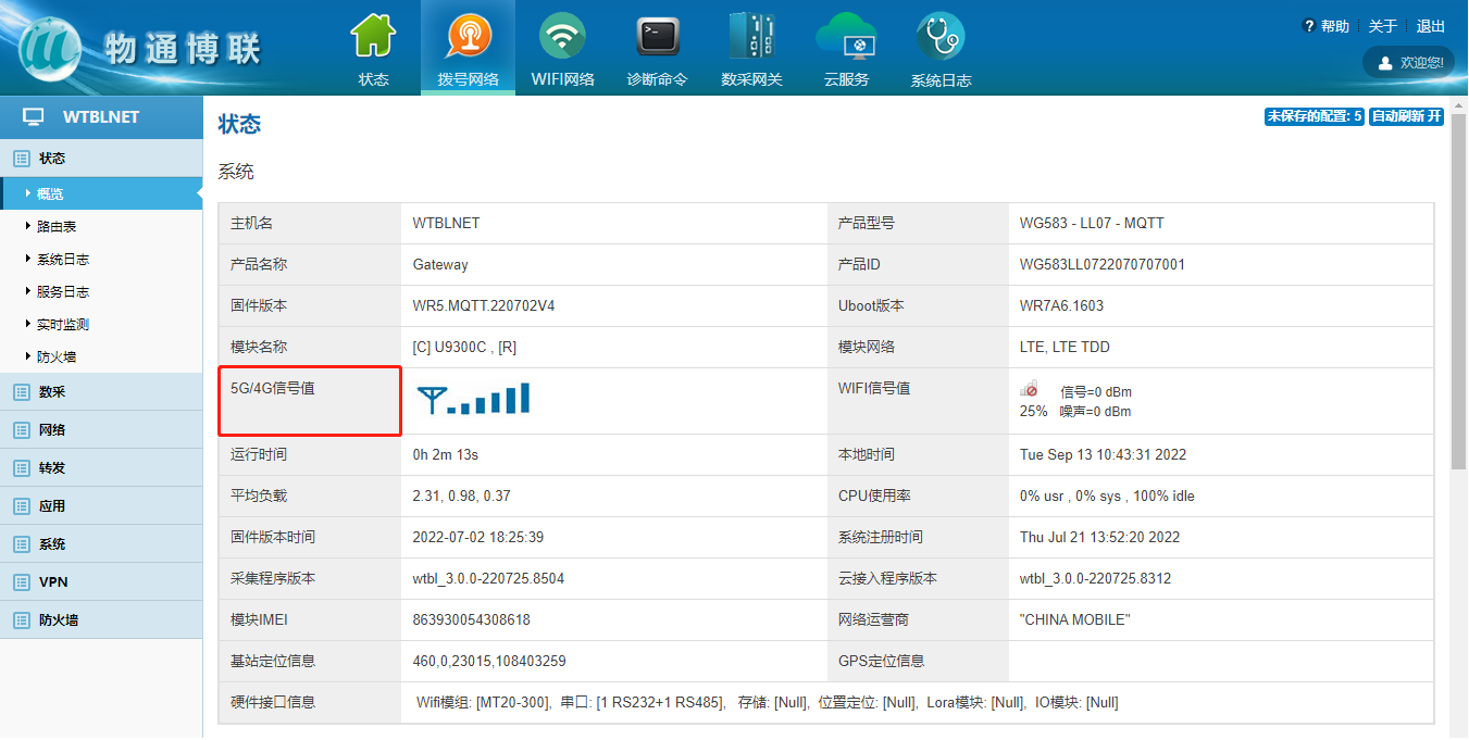 通常支持5G/4G/3G上網的網絡隔離器的出廠配置是5G/4G/3G流量卡上網的模式,使用上電前將流量卡、天線(5G/4G/3G天線延長線的SMA頭是針,網絡隔離器上的連接頭是孔)裝上就可以了。也可以進入網絡隔離器的WEB界面,查看5G/4G/3G信號值以及5G/4G/3G網絡聯網情況,如下圖: