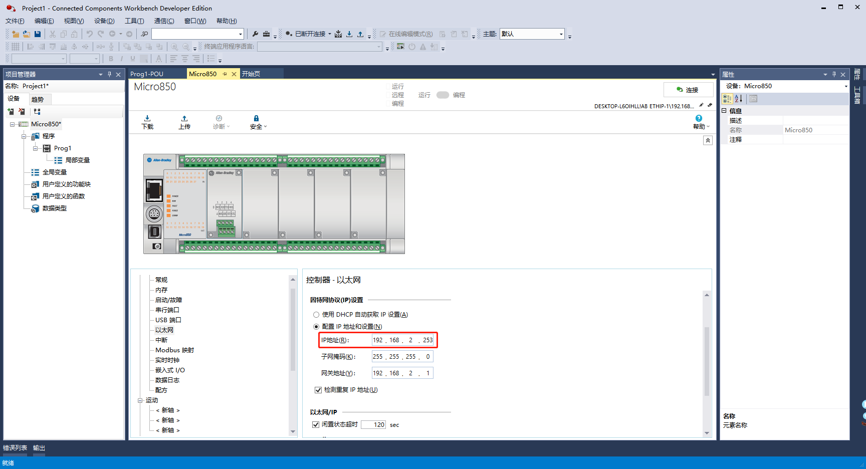 1、Allen-Bradley Micro850與電腦通過網(wǎng)絡(luò)連接,利用Connected Components Workbench獲取與設(shè)置IP地址、子網(wǎng)掩碼與默認(rèn)網(wǎng)關(guān)。