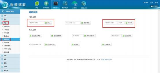 進入網關WEB界面,在“網絡”- >“網絡診斷”界面中,通過Ping和Telnet可測試網關是否和松下PLC正常連接。
