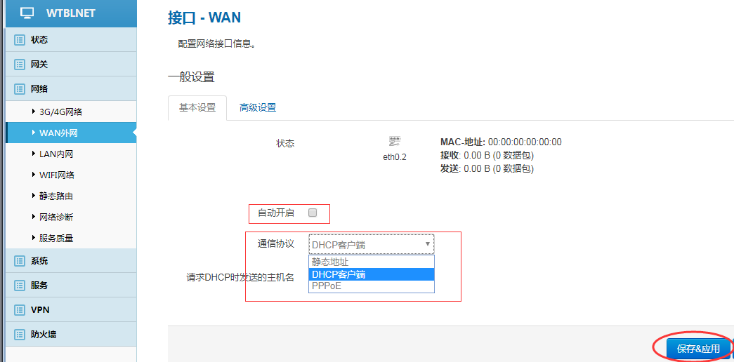 勾選 自動(dòng)開啟,選擇通信協(xié)議(靜態(tài)地址、DHCP客戶端、PPPOE,三選一),保存&應(yīng)用。