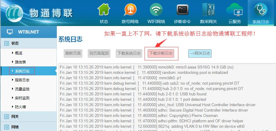 如果通過如上設(shè)置還是沒辦法上網(wǎng),請(qǐng)下載診斷日志,然后發(fā)給物通博聯(lián)工程師;我們工程師會(huì)根據(jù)系統(tǒng)日志診斷問題并提出指導(dǎo)建議。