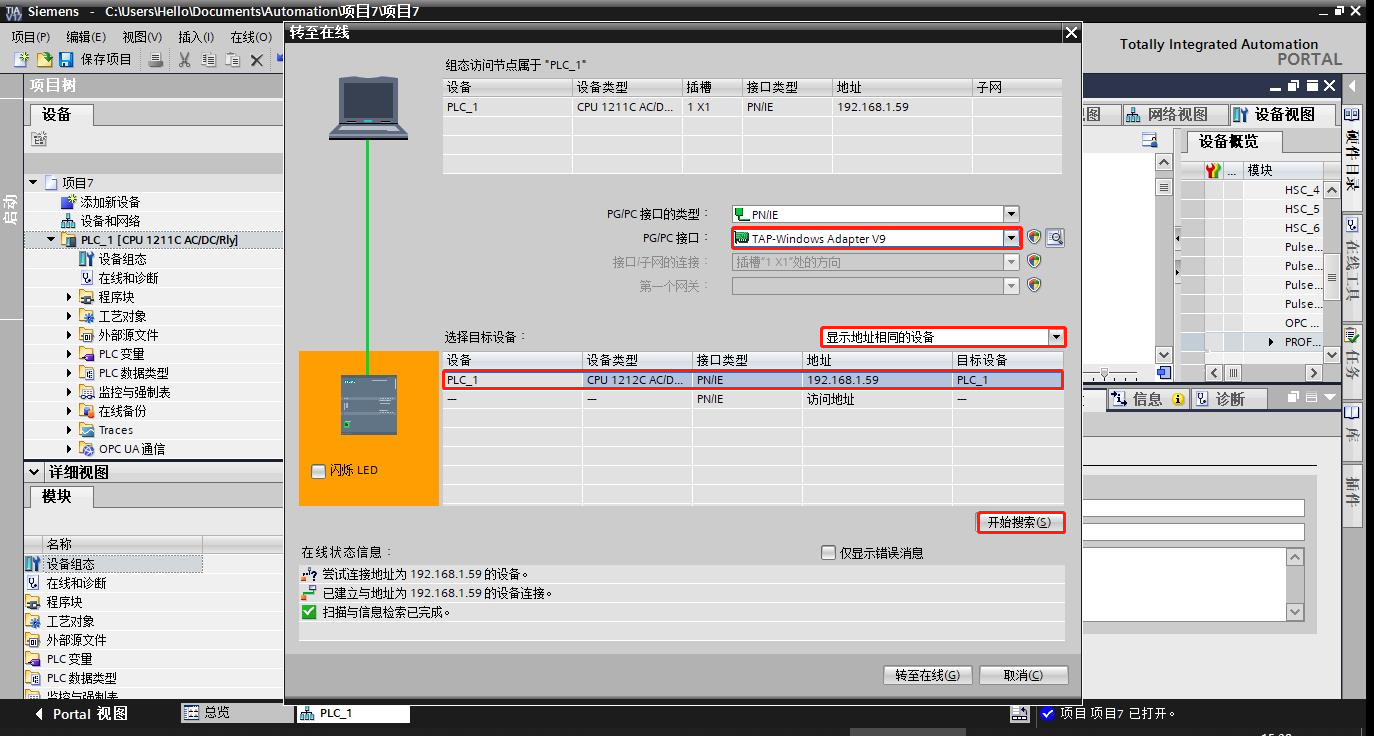 2、在線連接,選擇PN/IE接口類型,“TAP Windows Adapter V9”接口,選擇顯示地址相同的設(shè)備-在顯示列表中手動(dòng)輸入設(shè)備的IP地址-點(diǎn)擊開始搜索。