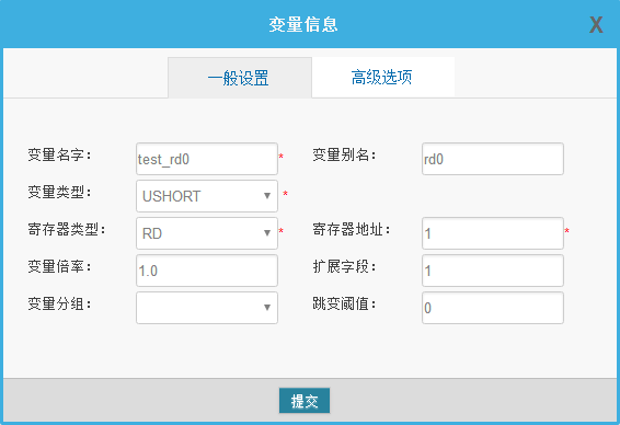 變量配置主要是定義變量名(自定義內容,不可使用中文命名)、變量別名(自定義,可使用中文名字)、寄存器類型和寄存器偏移地址,并定義一些數據規則(如:倍率、小數點、單位、告警)。
