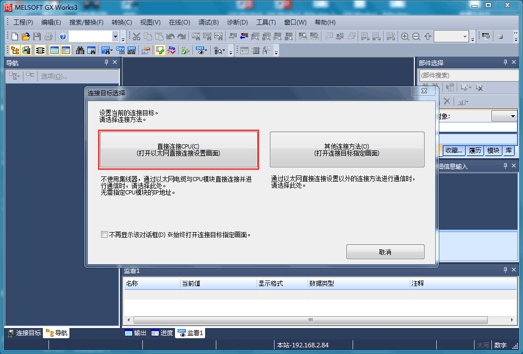 2、“CPU模式”設(shè)置,“經(jīng)由集線器連接”,填寫(xiě)控制器的IP地址。