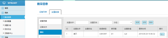 數采配置(設備信息+變量參數)完成后,重啟采集程序并生效配置,即可在:數采信息---變量數據---設備名稱中看到采集上來的數據。
