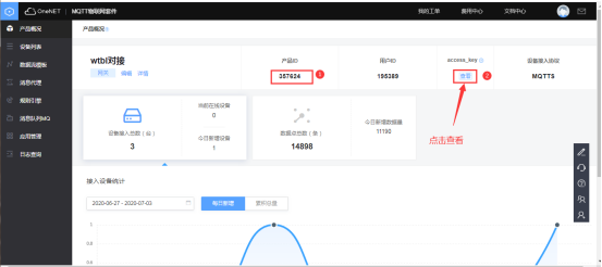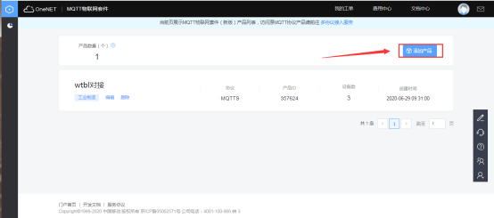 可進(jìn)入OneNET平臺(tái)的對(duì)應(yīng)產(chǎn)品中獲取網(wǎng)關(guān)云服務(wù)中心所需要填寫的ID和KEY。