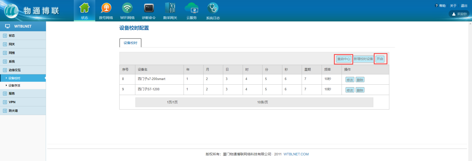 點擊“開啟”按鈕(注意:當該設備校時功能處于關閉狀態時,該按鈕顯示開啟,反之顯示關閉);點擊“重啟中心”按鈕,等待提示成功,使配置生效。
