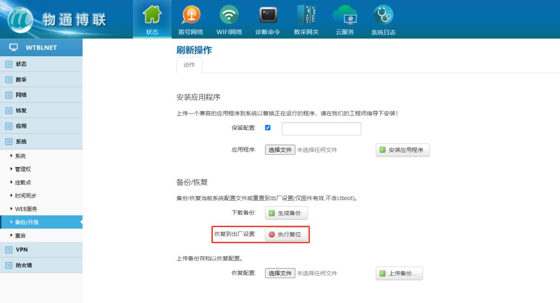 下載中心 視頻中心 常見問題 售后服務 工業網關 設備快線 數據云平臺 聯網設備 問答百科 工業智能網關如何進行軟硬件復位? 時間:2022-10-26 09:13:38 點擊:5552 關鍵詞:工業智能網關,網關復位,網關重啟 問題:工業智能網關如何進行軟硬件復位? 回答: (1)硬件復位 首先斷電后再通電重啟設備網關,當網關指示燈STATUS和WARN交替閃爍后,立即長按RESET鍵,直到ERROR燈慢閃后松開(或3秒后松開),再次長按RESET鍵,直到ERROR燈快閃后松開按鈕(或3秒后松開),網關開始復位 (2)軟件復位 系統——備份/升級——恢復到出廠設置 上一篇:工業智能網關如何設置靜態固定IP? 下一篇: 工業智能網關和DTU有什么區別嗎?