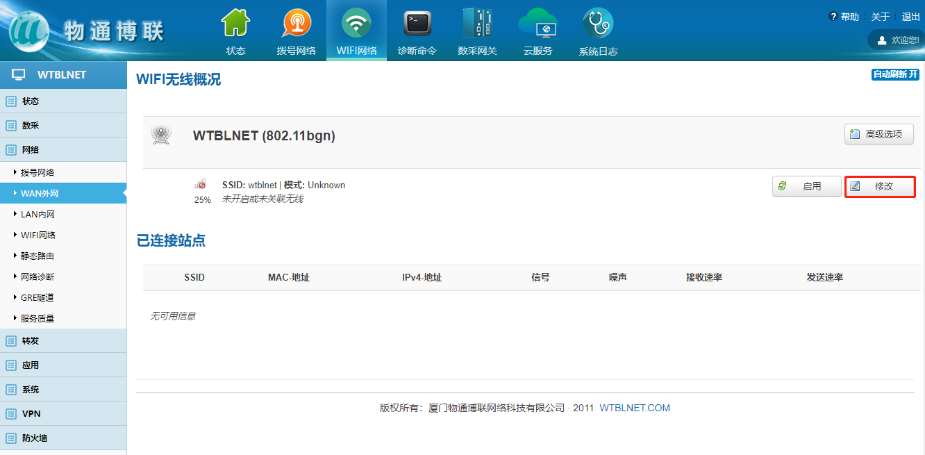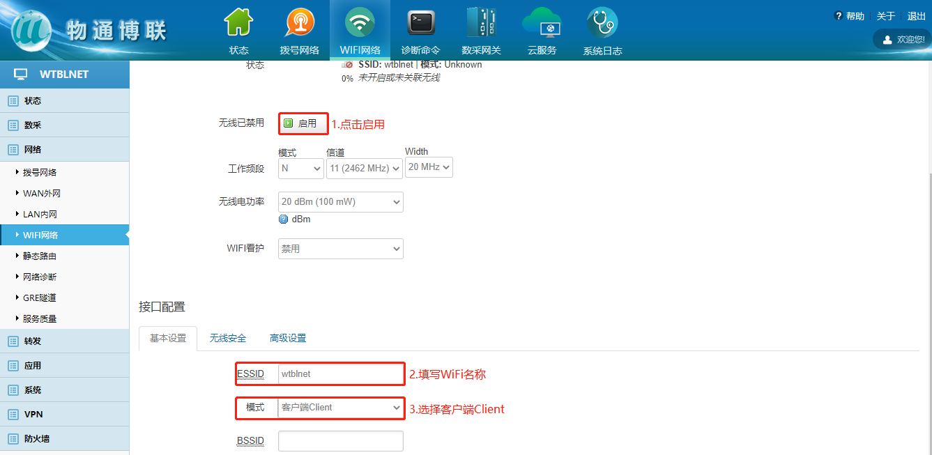 下載中心 視頻中心 常見問題 售后服務 工業網關 設備快線 數據云平臺 聯網設備 問答百科 工業智能網關如何連接wifi熱點? 時間:2022-10-26 09:15:30 點擊:5205 關鍵詞:工業智能網關,wifi 問題:工業智能網關如何連接wifi熱點? 回答: (1)電腦通過網線接入到網關LAN口,瀏覽器輸入192.168.2.1默認地址 (2)登陸網關配置界面選擇WiFi網絡 (3)點擊WiFi界面修改—進入WiFi配置界面 (4)啟用WiFi—填寫ESSID(WiFi名稱)—模式選擇客戶端Client (5)點擊無線安全—輸入WiFi密碼 注意:WiFi獲取到的IP網段與網關LAN口的IP網段不能重復! 上一篇:工業智能網關如何更新程序和固件? 下一篇: 工業智能網關如何使用流量卡上網?