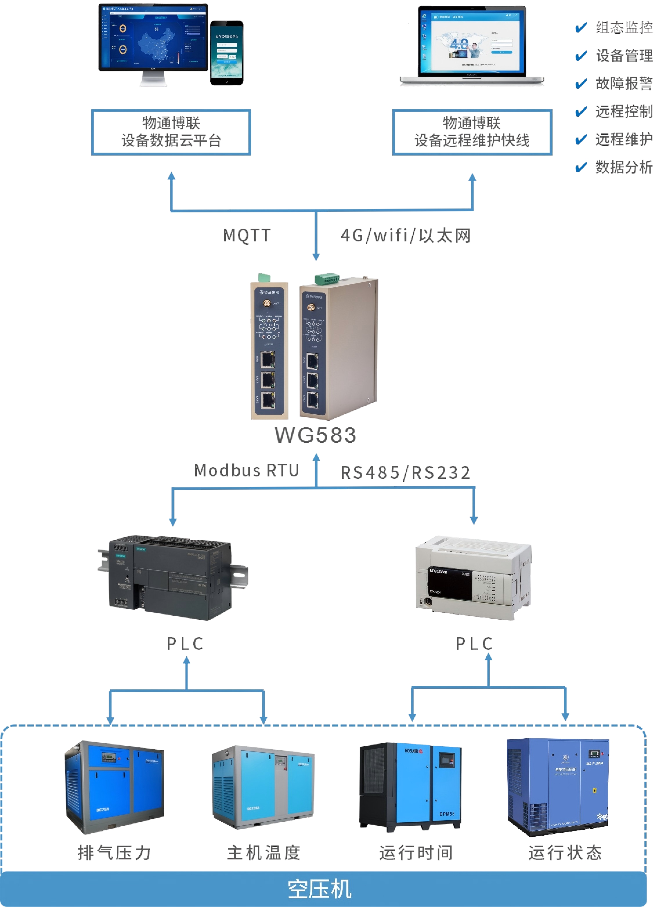 空壓機過載告警PLC數據采集解決方案 2025-09-17 空壓機作為工業生產中的核心動力設備,通過壓縮空氣為各類生產工藝提供穩定氣源,廣泛應用于機械制造、化工、電子、食品加工、礦山開采等眾多領域。 數據孤島:PLC與上位機、云平臺間協議不兼容,導致設備狀態無法實時共享; 告警滯后:過載故障依賴人工巡檢,響應時間較長,易引發設備損壞; 運維... 持續完善數據要素價值化路徑 2025-09-16 隨著數字技術深度融入經濟社會各領域,數據正日益成為與勞動力、土地、資本、技術并列的關鍵生產要素。在實踐中,無論是數據自身作為生產要素發揮作用,還是與傳統生產要素協同和融合,數據要素都能夠直接或間接產生經濟價值和社會價值。發揮數據要素規模報酬遞增、低成本復用等特點,將人類經濟社會活動中產生的海量數據,... 物料稱重設備監控管理系統解決方案 2025-09-16 在工業生產與物流倉儲場景中,物料稱重是計量、配料、交易的關鍵環節。傳統稱重設備管理依賴人工記錄、定期巡檢,存在數據易篡改、實時性差、設備故障響應慢等問題,導致計量誤差、生產中斷、庫存管理混亂等風險。 本方案以物通博聯智能數采網關為核心,接入控制器PLC、稱重儀表等設備,構建物料稱重設備全生命周... 污水處理設備數據采集到組態云平臺解決方案 2025-09-16 在水污染防治與水環境質量提升的進程中,污水處理設備的穩定運行、數據精準采集與高效管控,是企業落實環保責任、保障出水達標、實現綠色運營的核心環節。 傳統污水處理設備管理依賴人工巡檢與離線檢測,存在數據采集滯后、設備狀態不透明、調控響應慢等問題,難以滿足環保達標排放與精細化運營需求。本方案以物通博... 共2253條 15/564 頁 首頁 上一頁 上5頁 11 12 13 14 15 下5頁 下一頁 尾頁
