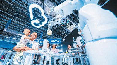 9月6日,2023中國國際數字經濟博覽會在河北省石家莊市開幕,圖為小朋友在博覽會上參觀工業機器人。朱海鵬攝(人民視覺)