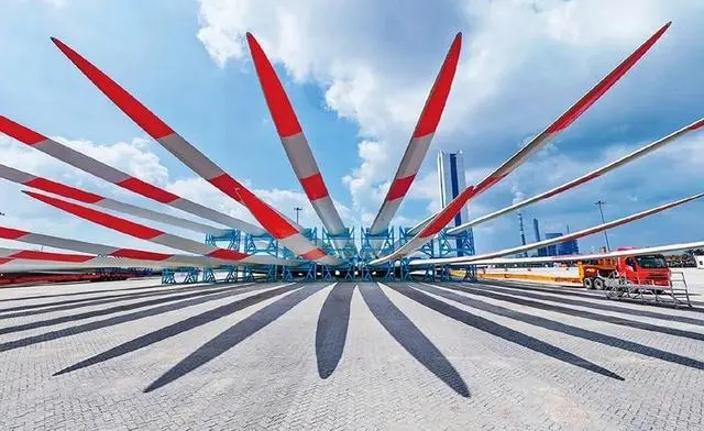 綠色低碳是新型工業化的生態底色。近年來,我國穩妥有序推進工業綠色低碳轉型,積極打造綠色產業集群,努力讓綠色成為高質量發展的鮮明底色。圖為2023年9月8日,一批風電葉片在江蘇省鹽城港射陽港區碼頭等待運輸。 新華社記者 李博/攝