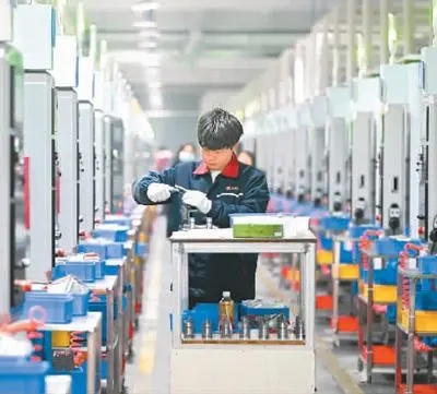 在位于浙江省寧波市的夏廈精密制造公司5G智能車間內,機械手臂正在作業。資料圖片