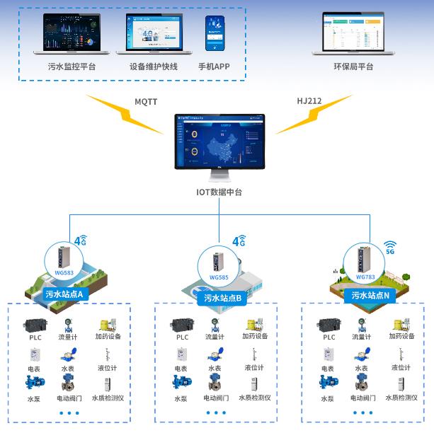 現(xiàn)要求將該水處理設(shè)備數(shù)據(jù)采集到物聯(lián)網(wǎng)平臺(tái)中,物通博聯(lián)提供高效可靠的物聯(lián)網(wǎng)解決方案。通過(guò)將物通博聯(lián)工業(yè)智能網(wǎng)關(guān)接入控制器PLC中,能夠?qū)崟r(shí)采集污水池液位、排污泵運(yùn)行狀態(tài)與工作時(shí)間、告警參數(shù)等,并通過(guò)5G/4G/WIFI/以太網(wǎng)等方式對(duì)接到物聯(lián)網(wǎng)平臺(tái)中,實(shí)現(xiàn)遠(yuǎn)程監(jiān)控、故障告警、遠(yuǎn)程控制、數(shù)據(jù)分析等功能,助力提高工作效率與管理水平。