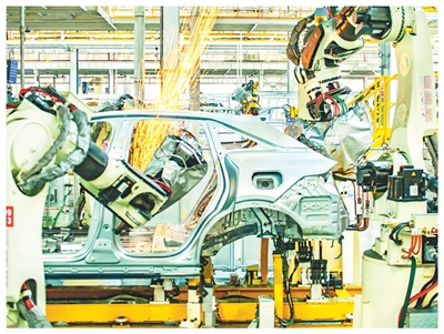 江蘇南京一家汽車自動化生產車間內,機械臂靈活焊接新能源汽車。朱紅生攝