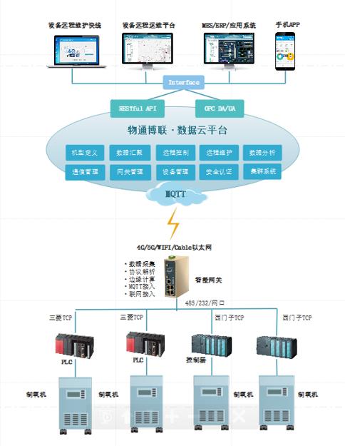 對此,物通博聯(lián)(WideIOT)工業(yè)智能網(wǎng)關(guān)通過采集各種PLC的數(shù)據(jù),經(jīng)過協(xié)議解析、邊緣計(jì)算后將數(shù)據(jù)標(biāo)準(zhǔn)化JSON報(bào)文字符串,然后以MQTT方式上報(bào)到設(shè)備數(shù)據(jù)中轉(zhuǎn)平臺,同時(shí)通過平臺將數(shù)據(jù)通過API接口轉(zhuǎn)發(fā)給MES系統(tǒng),從而以直觀動(dòng)態(tài)的圖像和數(shù)據(jù),實(shí)時(shí)展示車間各生產(chǎn)線或設(shè)備的運(yùn)行狀態(tài)、關(guān)鍵參數(shù)和各種故障報(bào)警信息,為生產(chǎn)管理提供全面可靠的數(shù)智化支持。