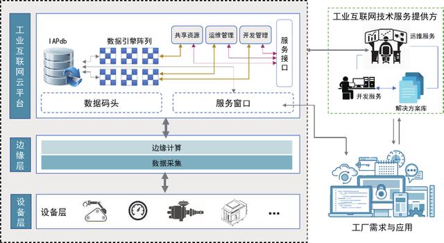 鑒于以上分析,我們提出一種面向服務(wù)的工業(yè)互聯(lián)網(wǎng)的架構(gòu)設(shè)計(jì),如圖4所示。其中,工業(yè)互聯(lián)網(wǎng)的核心部分是云平臺(tái),除了數(shù)據(jù)庫和數(shù)據(jù)引擎陣列外,需要部署共享資源、運(yùn)維管理和開發(fā)管理三個(gè)基本服務(wù)模塊。工廠設(shè)備的數(shù)據(jù)經(jīng)過邊緣層后送入云平臺(tái)的數(shù)據(jù)碼頭進(jìn)行緩存處理。云平臺(tái)的服務(wù)窗口用于工廠管理和生產(chǎn)各項(xiàng)應(yīng)用的響應(yīng),即應(yīng)用的可視化窗口。作為工業(yè)互聯(lián)網(wǎng)的第三方,技術(shù)服務(wù)提供方的主要任務(wù)包括與企業(yè)用戶連接,處理企業(yè)的應(yīng)用需求,調(diào)用解決方案庫,提供應(yīng)用開發(fā)服務(wù)。另外通過云平臺(tái)的服務(wù)接口,獲取工業(yè)互聯(lián)網(wǎng)運(yùn)行狀態(tài)信息,提供運(yùn)維管理,確保工業(yè)互聯(lián)網(wǎng)與企業(yè)生產(chǎn)管理過程保持同步。