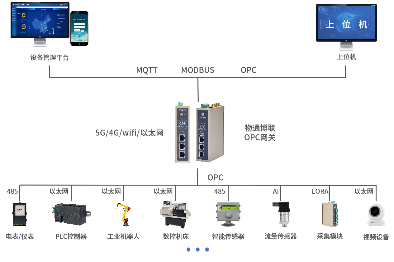 物通博聯(lián)OPC網(wǎng)關(guān)具有設(shè)備聯(lián)網(wǎng)、數(shù)據(jù)采集、協(xié)議解析、邊緣計(jì)算、云端接入等功能,支持OPC UA協(xié)議解析數(shù)據(jù)采集,能夠連接到PLC、儀器儀表、傳感器、數(shù)控機(jī)床、DCS、SCADA等,實(shí)時(shí)采集數(shù)據(jù)并通過Modbus/MQTT協(xié)議傳輸?shù)皆破脚_(tái)或本地上位機(jī),支持采集設(shè)備數(shù)據(jù)通過OPC UA協(xié)議轉(zhuǎn)發(fā)給組態(tài)軟件、上位機(jī)軟件、云平臺(tái),實(shí)現(xiàn)設(shè)備遠(yuǎn)程監(jiān)控、遠(yuǎn)程管理。