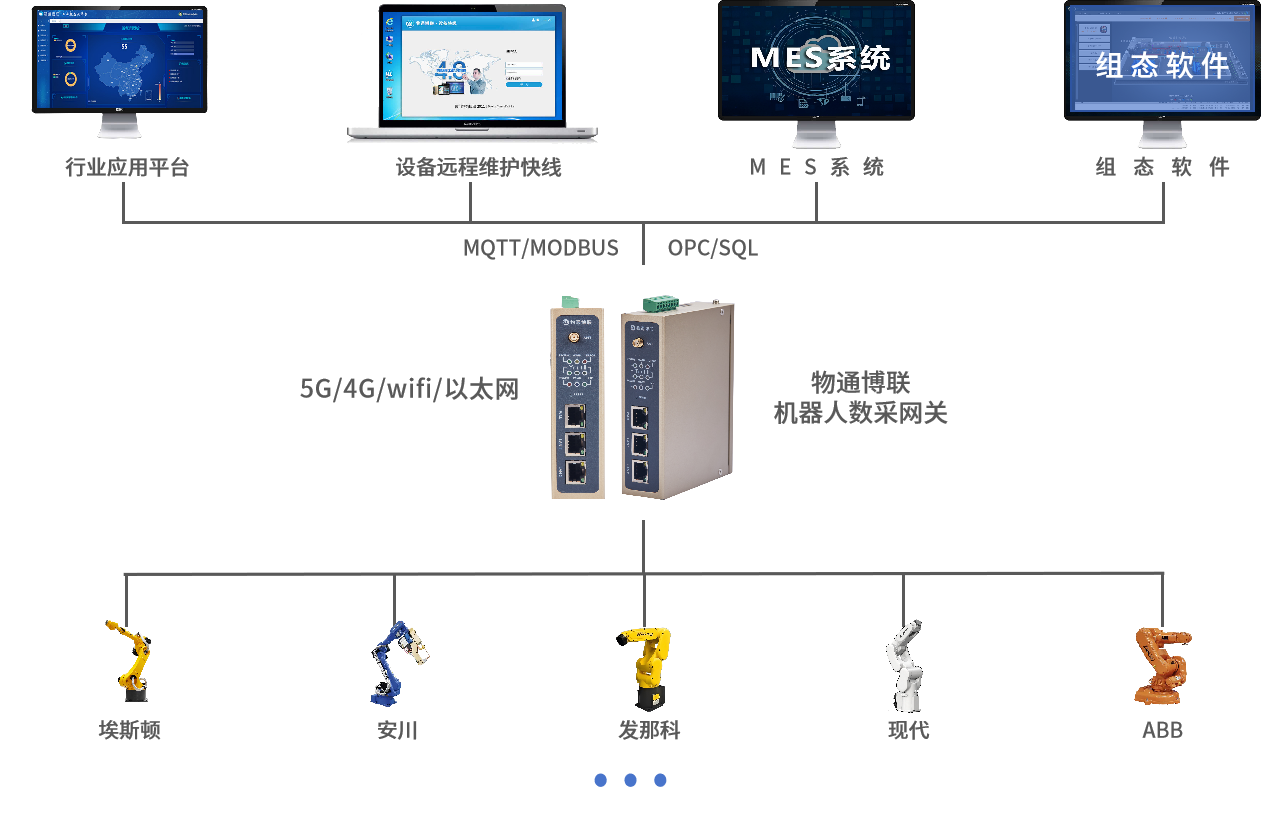物通博聯(lián)機(jī)器人數(shù)采網(wǎng)關(guān)支持采集市面上大部分的機(jī)器人(機(jī)械手臂)設(shè)備(發(fā)那科、ABB、現(xiàn)代、安川、埃斯頓……等等)的運(yùn)行狀態(tài)、工藝參數(shù)、故障信息、生產(chǎn)數(shù)據(jù)等數(shù)據(jù),將數(shù)據(jù)接入工廠的MES系統(tǒng)、工廠的加工系統(tǒng)、數(shù)據(jù)庫(kù)及物聯(lián)網(wǎng)系統(tǒng)物通博聯(lián)云平臺(tái)、設(shè)備管理平臺(tái)等,實(shí)現(xiàn)機(jī)器人設(shè)備的遠(yuǎn)程監(jiān)控和運(yùn)維,生產(chǎn)優(yōu)化與數(shù)據(jù)分析,有助于提高生產(chǎn)效率、降低成本、保障生產(chǎn)安全。