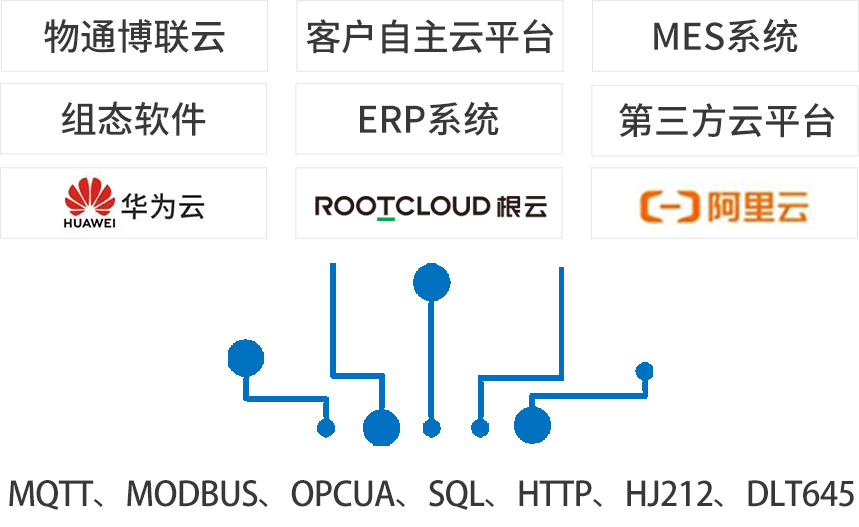 北向支持接入物通博聯(lián)云平臺(tái),客戶自主開(kāi)發(fā)的云平臺(tái),第三方云平臺(tái)(根云、美云、華為、阿里、百度、微軟等IOT云平臺(tái)),組態(tài)軟件、MES系統(tǒng)、行業(yè)監(jiān)控平臺(tái)等工業(yè)軟件