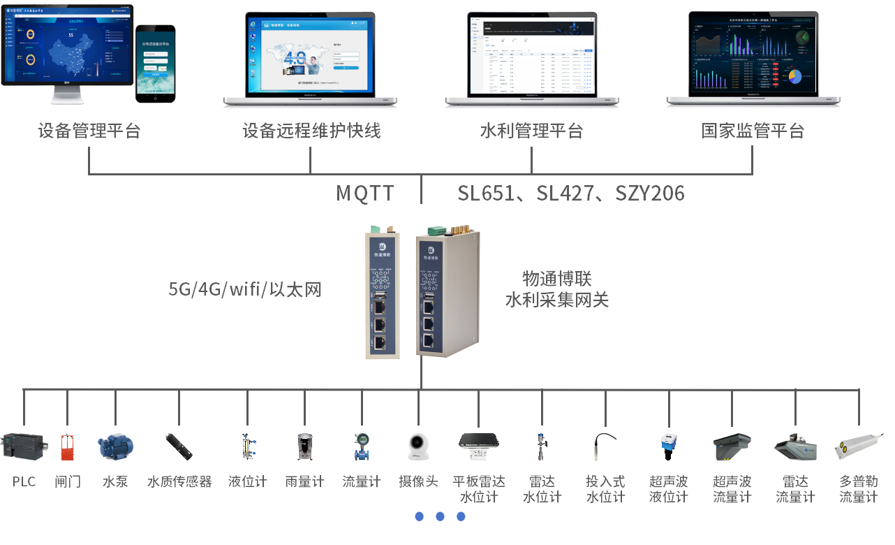 物通博聯水利采集網關支持水利行業標準,符合《水文監測數據通信規約》、《水資源監測數據傳輸規約》,可以連接各種水利設備、傳感器、儀表、IO數據和PLC,采集水位、流量、水質、氣體、泵站運行狀態等參數數據通過MQTT協議上傳到設備管理平臺和通過SL651、SZY206、SL427協議等上傳到水利監管平臺,實現對水利系統運行情況的全面掌握。