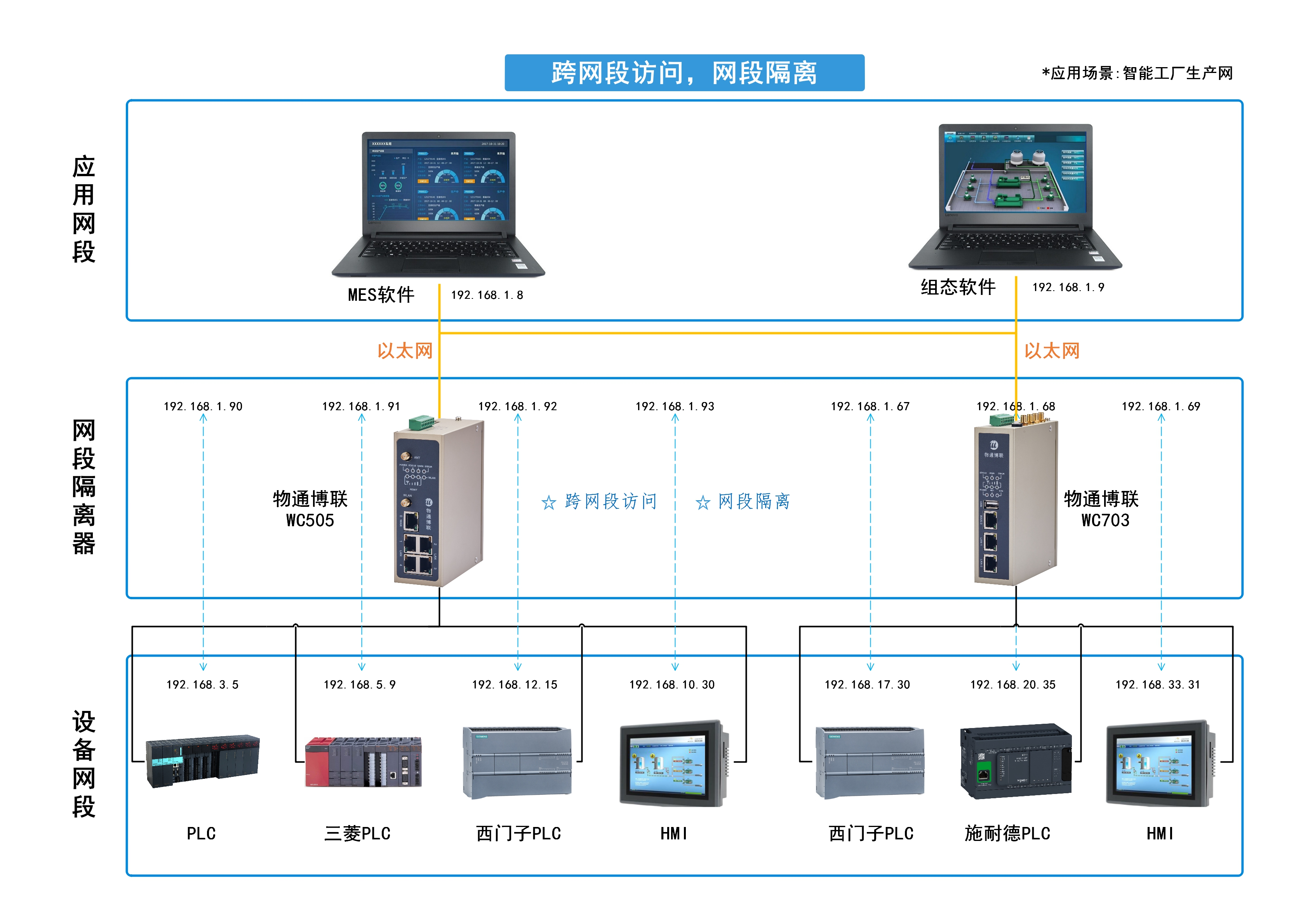 WC505網段隔離器(NAT轉換網關)適用于生產網絡對 PLC、HMI、CNC、DCS、MES等網絡通訊和數據采集,兼有跨網段隔離和IP轉換的功能。同時支持2臺以上設備(如PLC、CNC等)網段隔離和NAT 轉換;車間多個設備,如果有不同網段的IP地址,則可以統一成同一網段的IP地址,進行設備(PLC、CNC)的在線編程、數據采集、遠程管理等各種跨網段訪問。