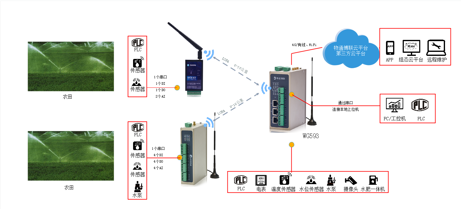 物通博聯(lián)的水肥一體化方案是通過LORA數(shù)采終端WD140或WD240與農(nóng)田現(xiàn)場的溫濕度傳感器、PLC、水肥一體機等設(shè)備連接,同時可以通過工業(yè)智能網(wǎng)關(guān)WG593獲取數(shù)據(jù),并通過4G/WIFI等方式上網(wǎng),MQTT方式上傳數(shù)據(jù),將數(shù)據(jù)傳到物通博聯(lián)數(shù)據(jù)云平臺或第三方平臺,云平臺實時監(jiān)控現(xiàn)場設(shè)備和水肥一體機的實時運行狀態(tài),實現(xiàn)電腦端和手機端的遠程監(jiān)控和控制,監(jiān)控整個農(nóng)田的運行情況,科學合理的安排灌溉施肥計劃,實現(xiàn)農(nóng)田自動化灌溉與施肥。