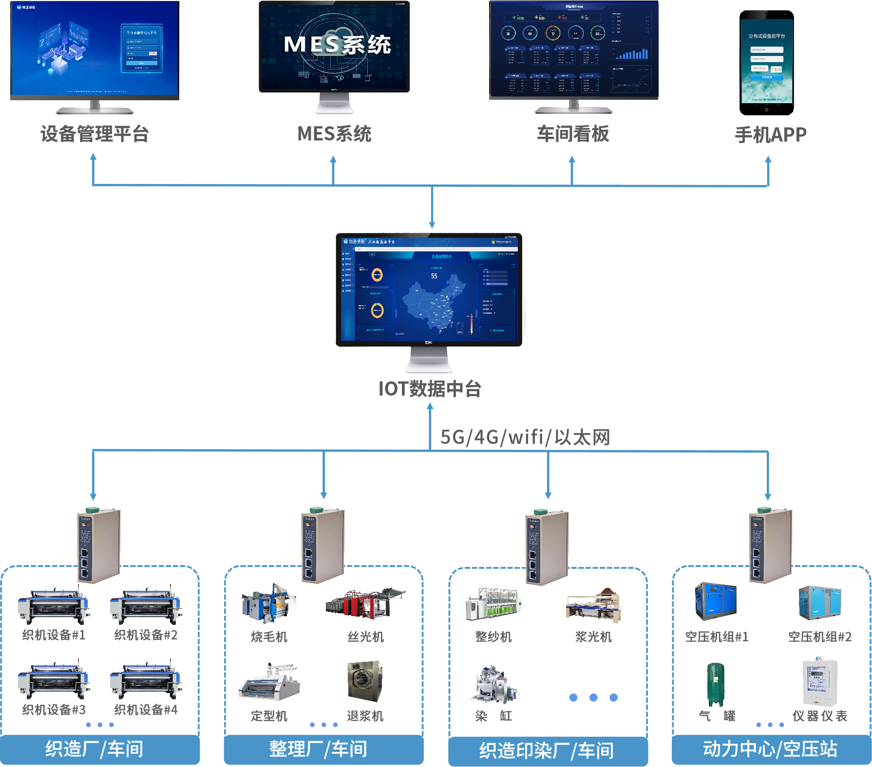 針對以上問題,物通博聯推出了基于PLC物聯網技術的紡織工廠設備監控運維系統解決方案。該系統通過工業智能網關與紡織機械的控制器PLC相連接,進行數據采集并以5G/4G、wifi、以太網等方式與物通博聯設備運維管理平臺實時通信,為設備管理、運維管理等方面提供高效便捷的管理手段。