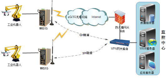 監控中心端采用ADSL/光纖接入Internet 公網,獲取固定公網ip。搭建vpn服務器。物通博聯工業無線路由WR515做vpn客戶端和服務器建立vpn隧道,實現兩端內網互通。數據庫服務器上運行采集系統,可以采集工業無線路由WR515下接的以太網plc數據以及工業機器人數據,從而達到采集監控工業機器人運行狀態目的。
