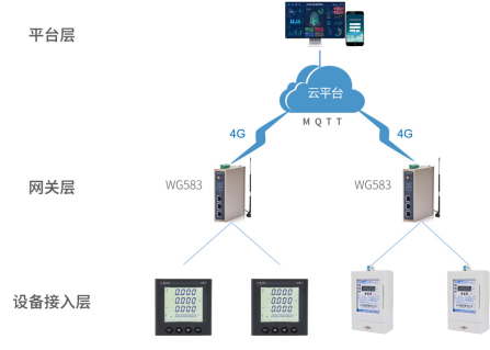 針對(duì)項(xiàng)目現(xiàn)場(chǎng)與需求,物通博聯(lián)提供一套產(chǎn)業(yè)園能耗監(jiān)測(cè)物聯(lián)網(wǎng)解決方案,通過(guò)物通博聯(lián)·工業(yè)智能網(wǎng)關(guān)WG583與電表RS485串口通信連接,采集能耗數(shù)據(jù)并通過(guò)MQTT協(xié)議Json格式傳輸?shù)皆品?wù)器中,在客戶云平臺(tái)中實(shí)現(xiàn)能耗遠(yuǎn)程監(jiān)測(cè)、自動(dòng)預(yù)警、成本核算、數(shù)據(jù)分析等功能,減輕巡檢工人的勞動(dòng)強(qiáng)度,降低人工成本,同時(shí)也能為減少能源浪費(fèi)、提高能源利用效率提供可靠數(shù)據(jù)支持。