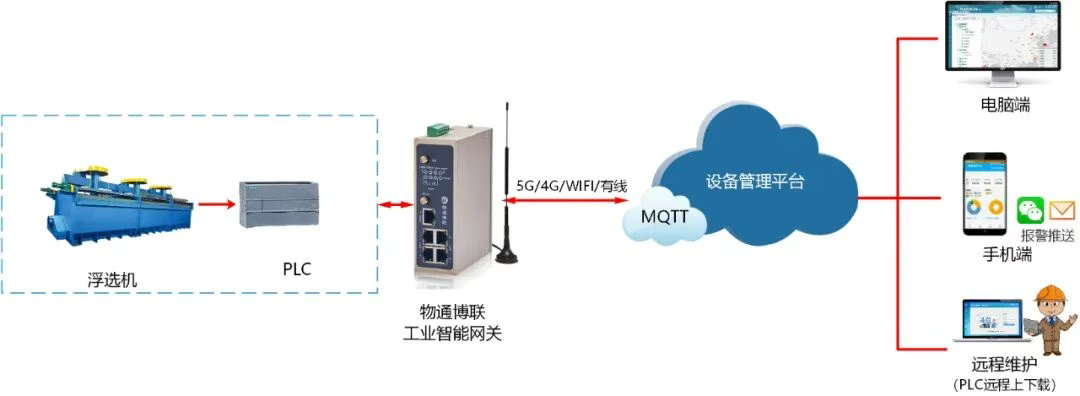 網關具備多個串口和網口,能夠實時采集浮選機PLC中的各類數據,包括設備狀態(運行/停止、故障報警)、工藝參數(礦漿濃度、藥劑添加量、充氣量、液位、流量)等。
